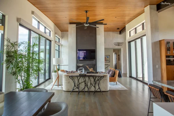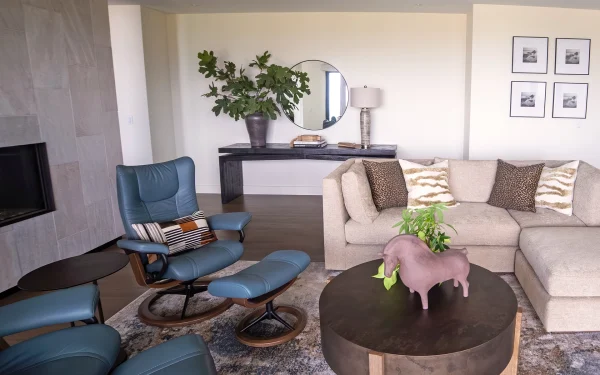 The feather embodied the rich colors of the fabrics they would choose, suggested the subtle movement of the stone that would connect the interior of the house to the outside space. It would inspire the edgy black elements at the fireplace repeated in some of the lighting… and the addition of warm golden tones to add a hint of glam girl vibe for the amazing owner…and finally it would allow fur and animal patterns for fun, lightness and just a tad of whimsy…